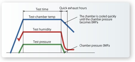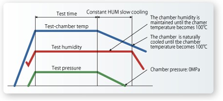 시험 종료 후, 챔버 내 온도 100℃ 이하, 조내 압력 0MPa가 될 때까지 시험 습도를 유지하면서 서냉합니다. 급격한 배기를 함으로써 시료에 가해지는 압력 스트레스와 건조를 방지합니다. 또, 도중 꺼내기의 영향을 최소한으로 억제한 정밀도 높은 시험을 할 수 있습니다.