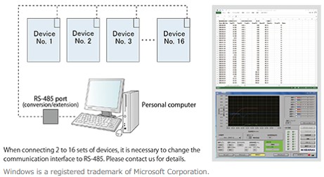본 제품은 RS-485 포트를 표준으로 갖춤. 전용 소프트웨어(Windows 대응)로 PC로부터의 시험 조건의 설정·확인, 시험 상태·트러블 상태의 파악, 데이터 처리 등 모든 작업을 일괄적으로 실시할 수 있습니다. 또, 1대의 PC로 최대 16대의 집중 감시·집중 관리가 가능한 네트워크 시스템을 실현했습니다.