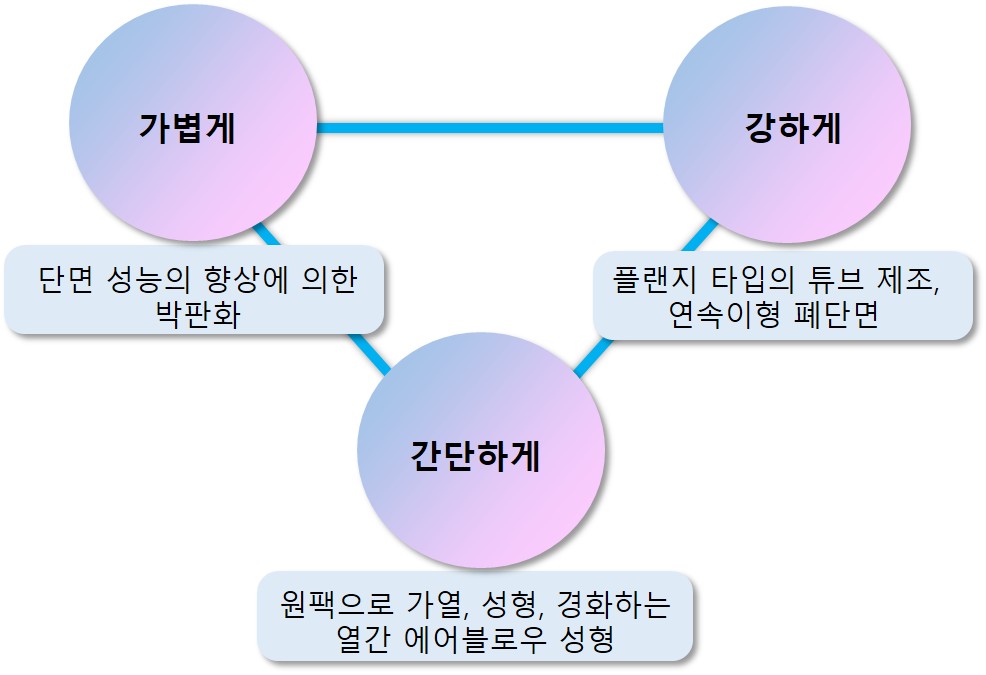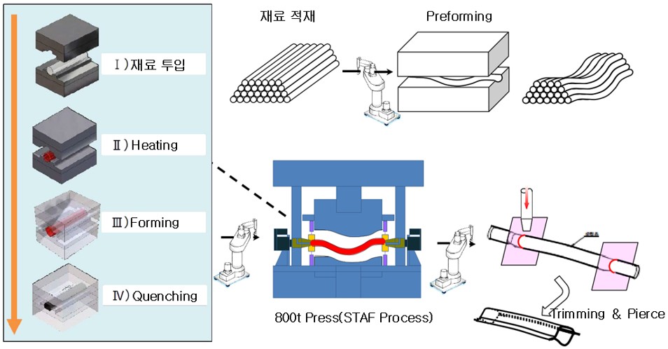 STAF 가공 부품은 1500MPa가 넘는 재료 강도를 가지며, 연속적으로 변화하는 단면적을 가지며, 높은 강성을 발휘합니다. 기존의 핫 스탬핑 가공 부품과 비교하여 약 30%의 경량화 효과를 얻을 수 있습니다