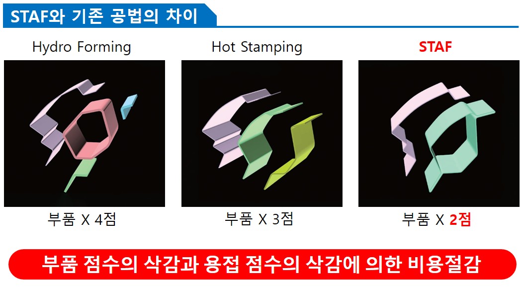 STAF는 플랜지를 이용한 자체 연속 폐단면과 PHS(프레스 경화강)의 높은 재료 강도를 실현해 자동차 경량화와 충돌 안전성 향상에 기여하고 있습니다.