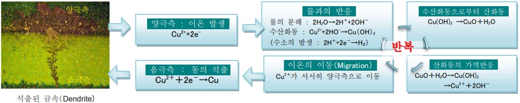 이온 마이그레이션(Electro Chemical Migration) 현상이란, 프린트 기판 등에서 본래 양호한 도체간의 절연 특성이, 도체로부터 용출되는 금속 이온이 도체간에 석출함으로써 절연이 저하되는 현상입니다. 이 전기화학적 작용은 온습도 분위기에서 도체 사이에 전압이 인가됨으로써 촉진됩니다. 절연물 중의 불순물 이온이 영향을 미치는 경우도 있습니다.
