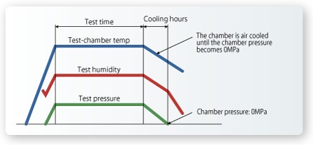시험 종료 후, 챔버 내 온도 100℃ 이하, 조내 압력 0MPa가 될 때까지 시험 습도를 유지하면서 서냉합니다. 급격한 배기를 함으로써 시료에 가해지는 압력 스트레스와 건조를 방지합니다. 또, 도중 꺼내기의 영향을 최소한으로 억제한 정밀도 높은 시험을 할 수 있습니다.