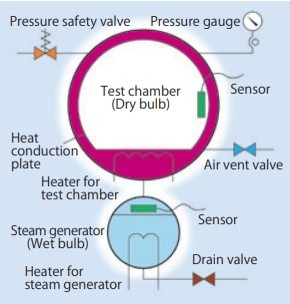 본 제품은 기존에 시행되어 온 수많은 시험 조건과의 상관성을 중시, 2가지 제어 방식[포화, 불포화], 3가지 타입의 배기 모드[습도유지 서냉 모드, 보습냉각 모드, 급속배기 모드]로 시험 목적에 따라 운용할 수 있습니다.